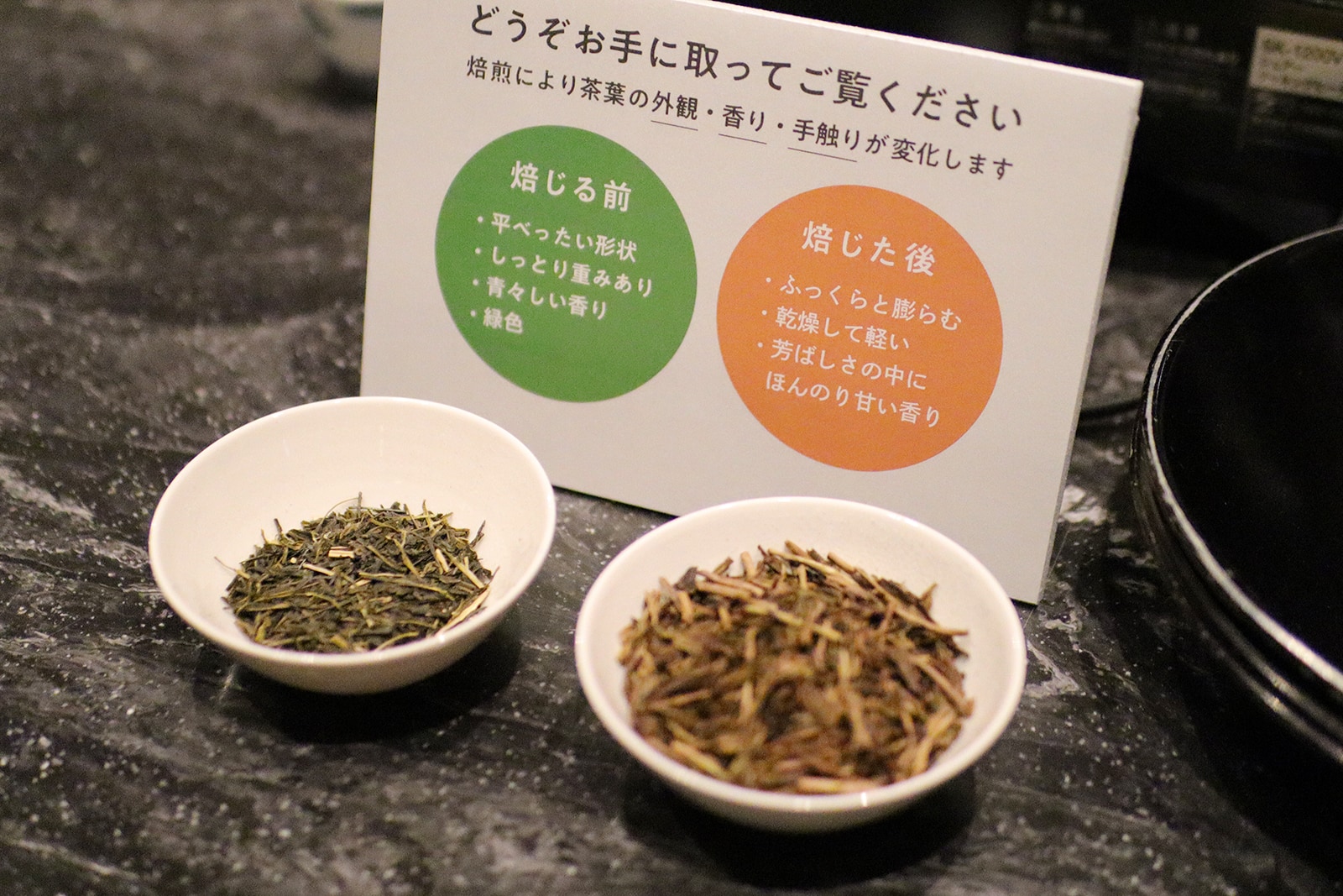 基本的な作り方に「こうやって作られるんだ」と興味津々の参加者のみなさんは、焙じる前と焙じた後の茶葉のちがいを五感で学びました。
