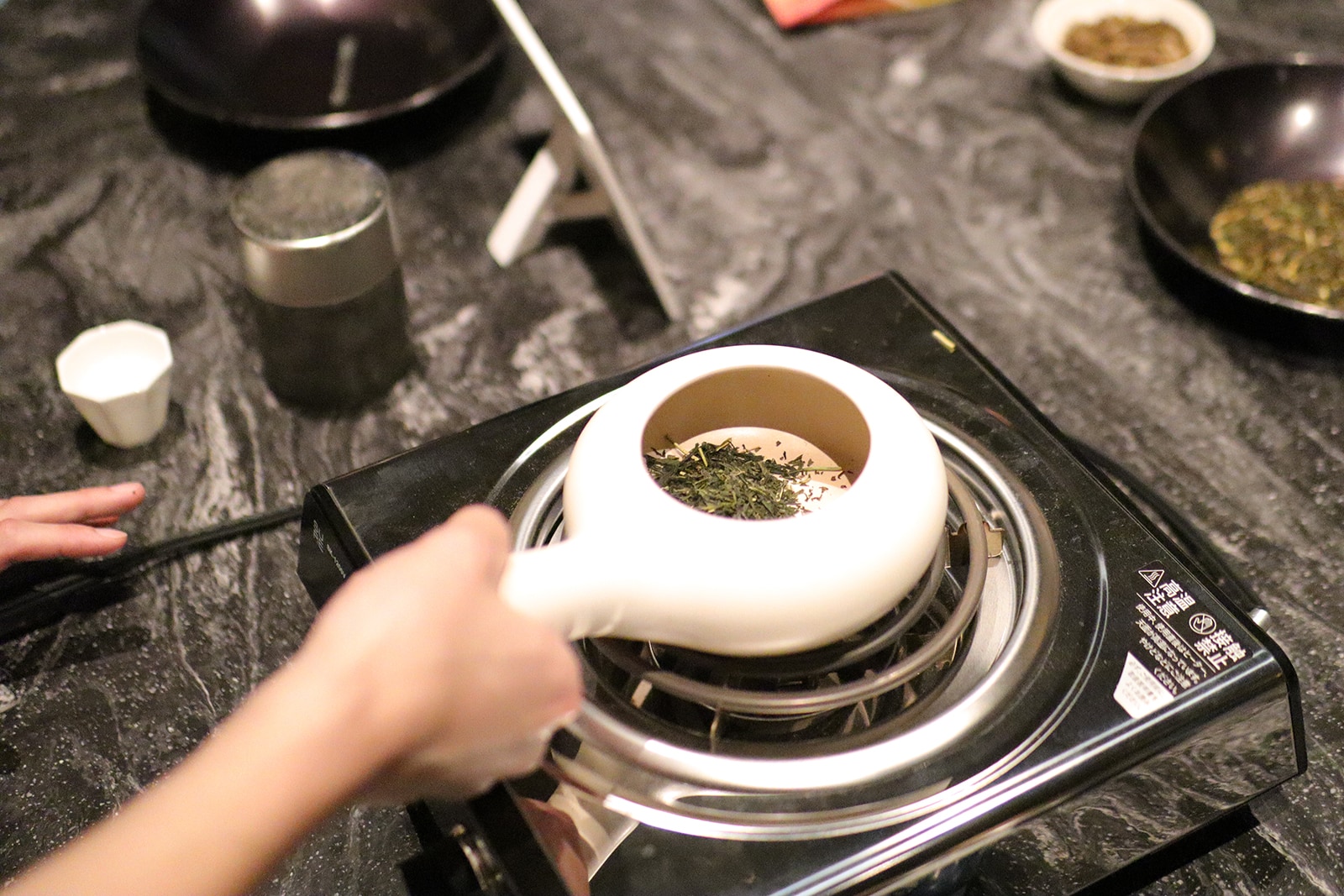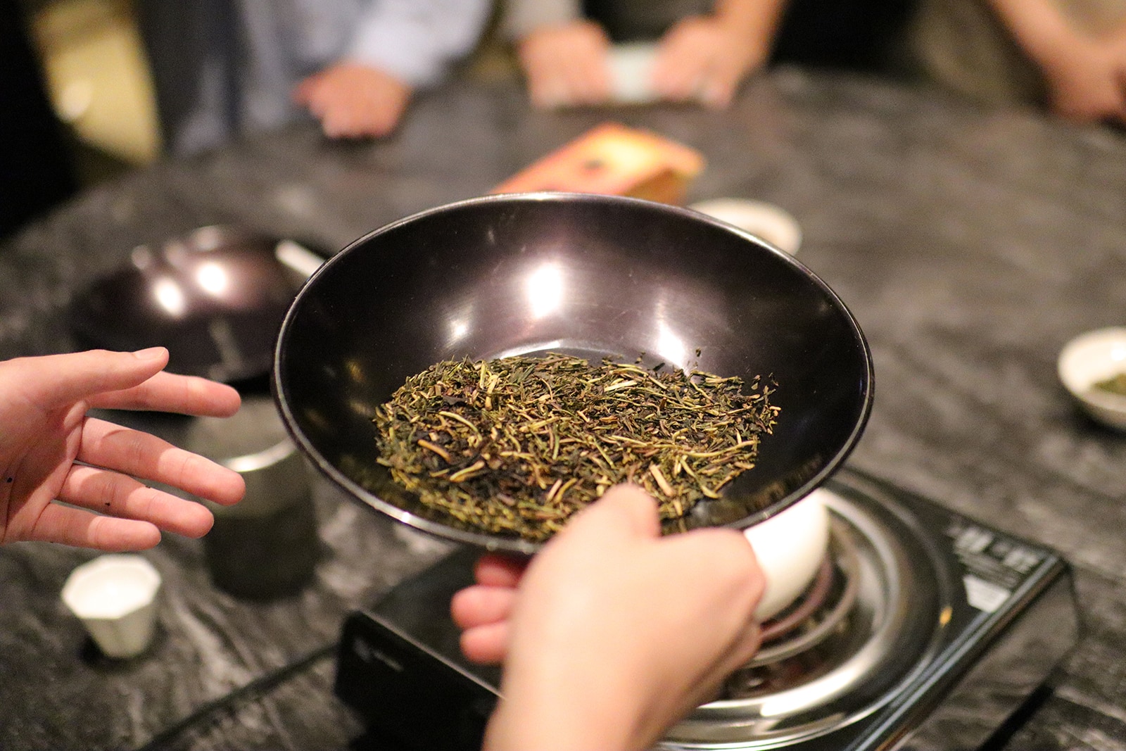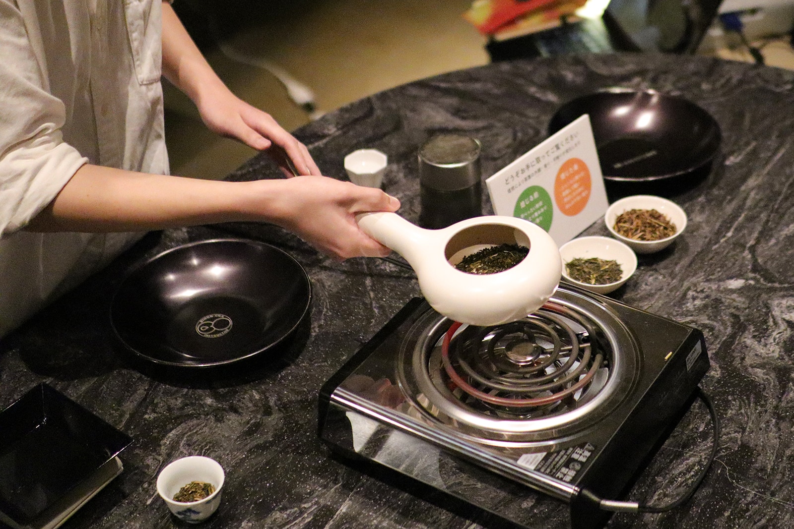 さらに、実際に茶葉を炒る焙煎の実演も行われ、会場はほうじ茶の香ばしい香りでいっぱいに。