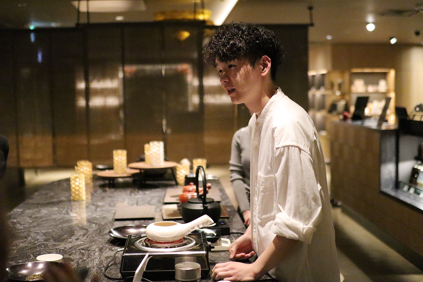 老舗茶店で指南を受けた堀さんが、お茶を淹れながら加賀棒茶の歴史や茶葉の焙煎方法、茶店ごとのこだわりを紹介。