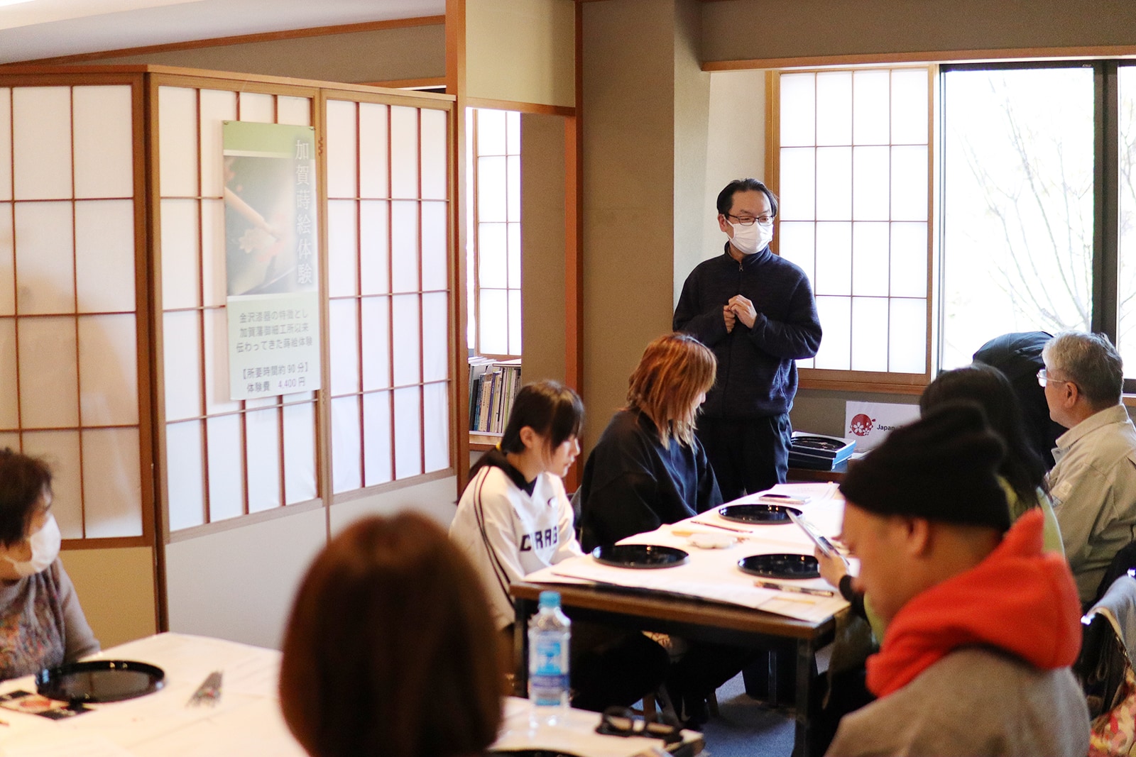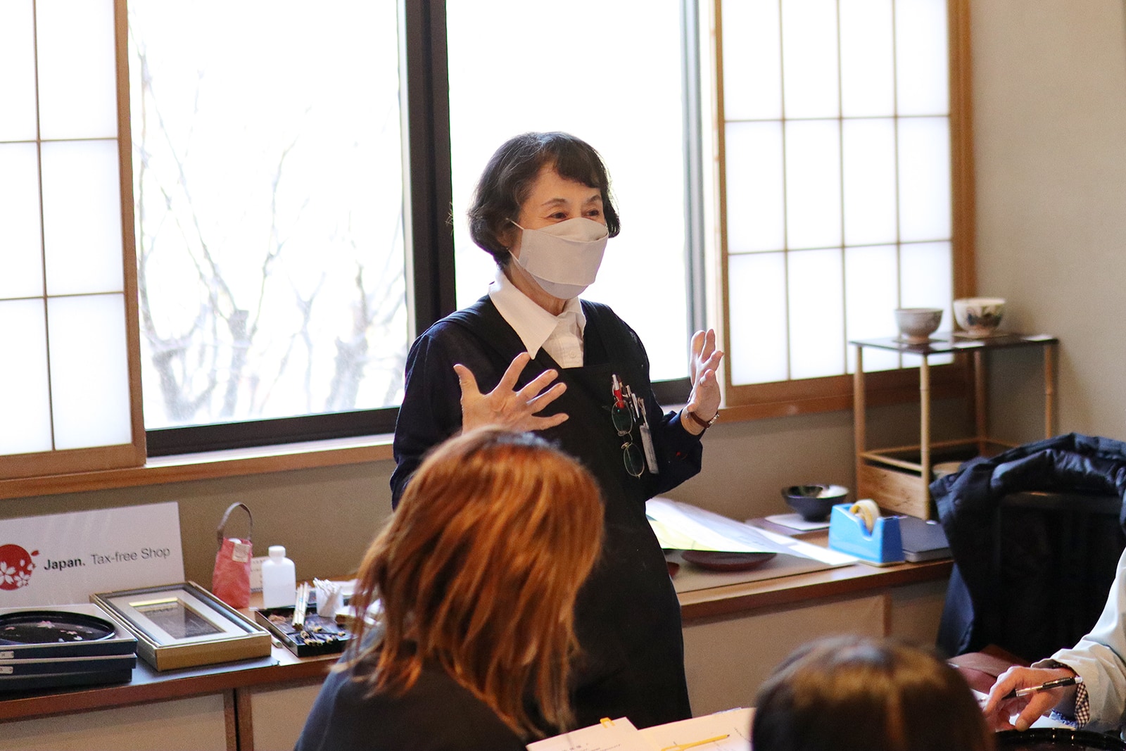 ここからは能作のスタッフの方にバトンタッチし、蒔絵体験の基本的な流れをレクチャー。