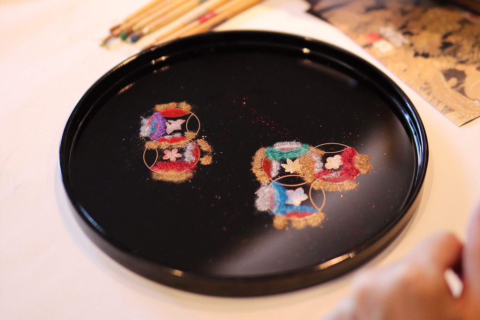 体験では、あらかじめ輪郭線が描かれたお盆の中から好きなデザインを選び、蒔絵の色付けをしていきます。